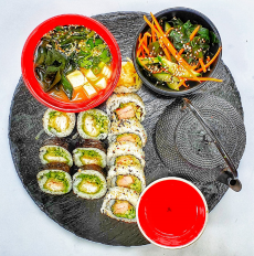 8 x Hosomaki awokado serek 8 × Hosomaki rzepa chili serek 2 x Koszyki tatar łosoś owijany łososiem 2 × Koszyki sałatka krabowa owijana tuńczykiem 12 x Nigiri łosoś tuńczyk krewetka węgorz -